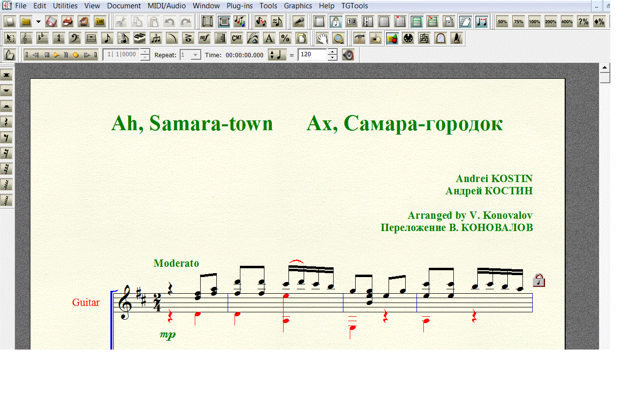 Переложение песни Андрея Костина АХ, САМАРА-ГОРОДОК для 6-й гитары в формате FINALE 2008 (расширение .mus). Под нотной строкой добавлена таблатурная строка, что бы вы сами могли создать и редактировать собственную «распальцовку».