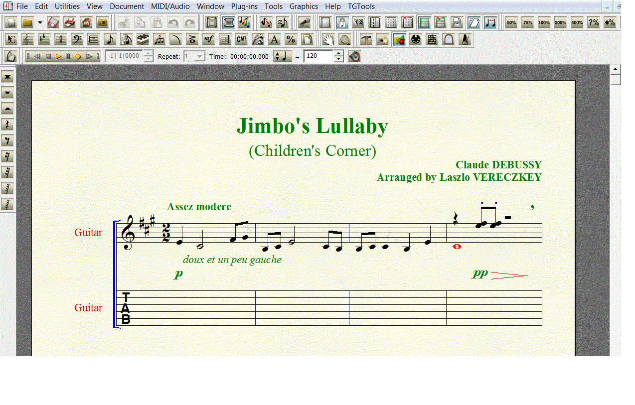Нотный набор выполнен в FINALE 2008 (расширение .mus). Под нотной строкой добавлена таблатурная строка, что бы вы сами могли создать и редактировать собственную «распальцовку».