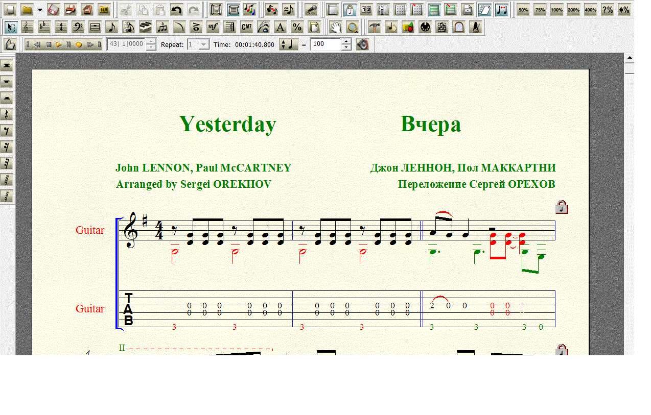 Нотный набор выполнен в FINALE 2008 (расширение .mus). Таблатура проставлена в таблатурной строке под нотной строкой.