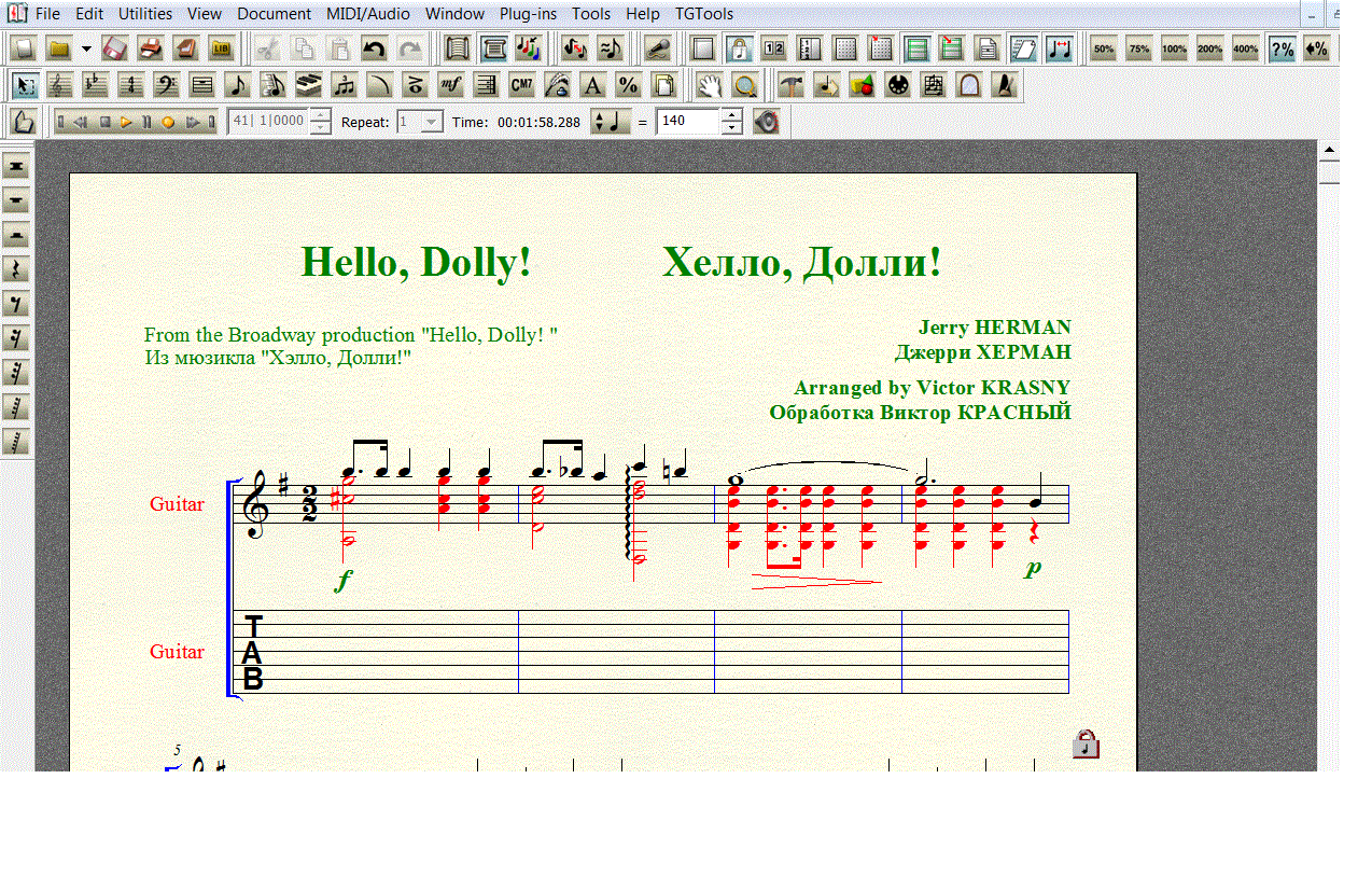 Переложение песни Джерри Хермана (Jerry Herman) ХЕЛЛО, ДОЛЛИ! (HELLO, DOLLY!). Переложение для 7-й гитары. Нотный набор выполнен в FINALE 2008 (расширение .mus). Под нотной строкой добавлена таблатурная строка, что бы вы сами могли создать и редактировать собственную «распальцовку».