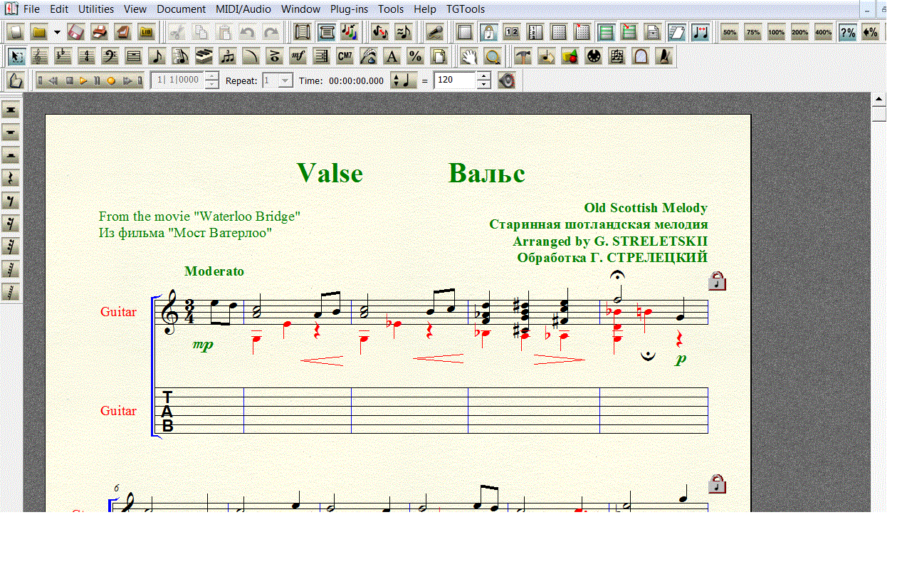 ВАЛЬС из фильма "Мост Ватерлоо" (старинная шотландская мелодия). Переложение для 6-й гитары. Нотный набор выполнен в FINALE 2008 (расширение .mus). Под нотной строкой добавлена таблатурная строка, что бы вы сами могли создать и редактировать собственную «распальцовку».