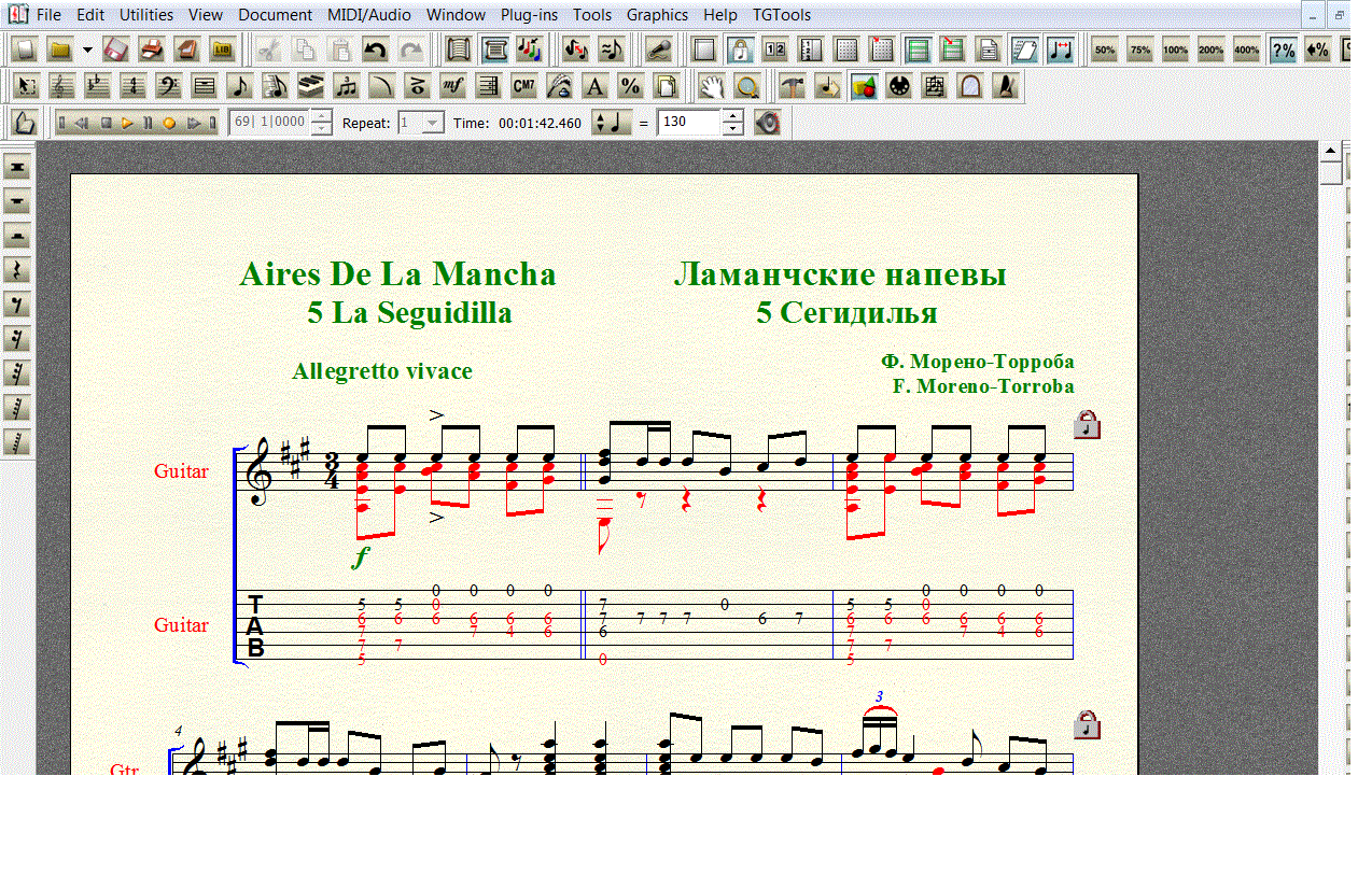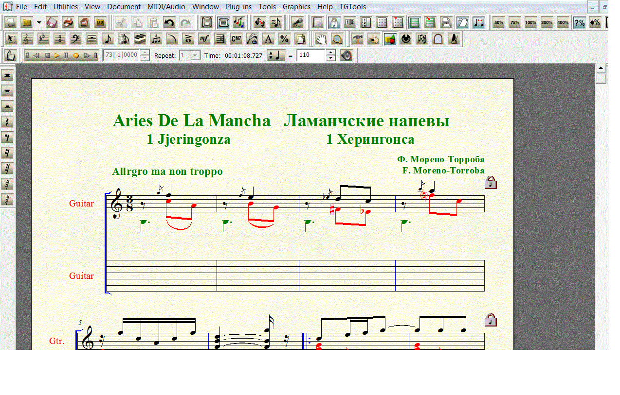 Для 6-й гитары в формате FINALE 2008 (расширение .mus). Под нотной строкой добавлена таблатурная строка, что бы вы сами могли создать и редактировать собственную «распальцовку».