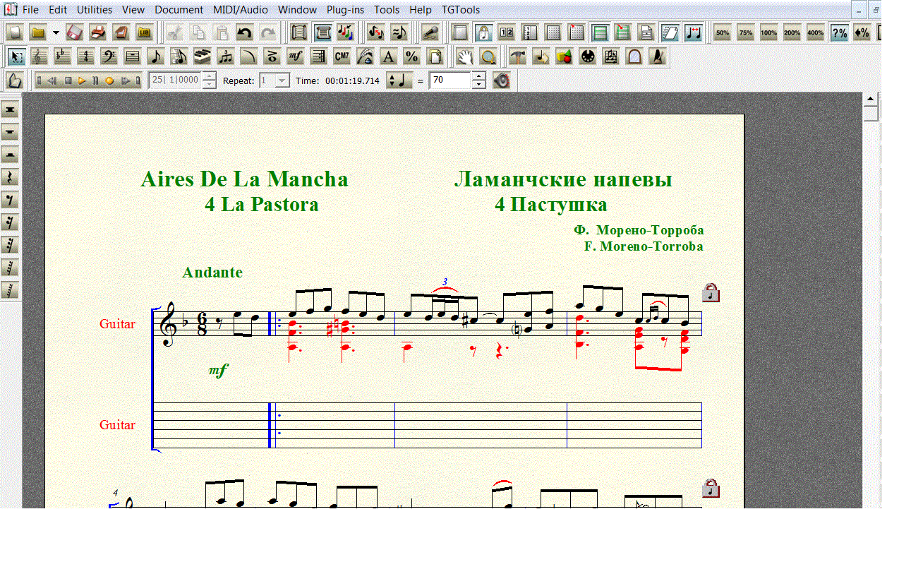 Под нотной строкой добавлена таблатурная строка, чтобы вы могли сами создавать и редактировать "распальцовку".