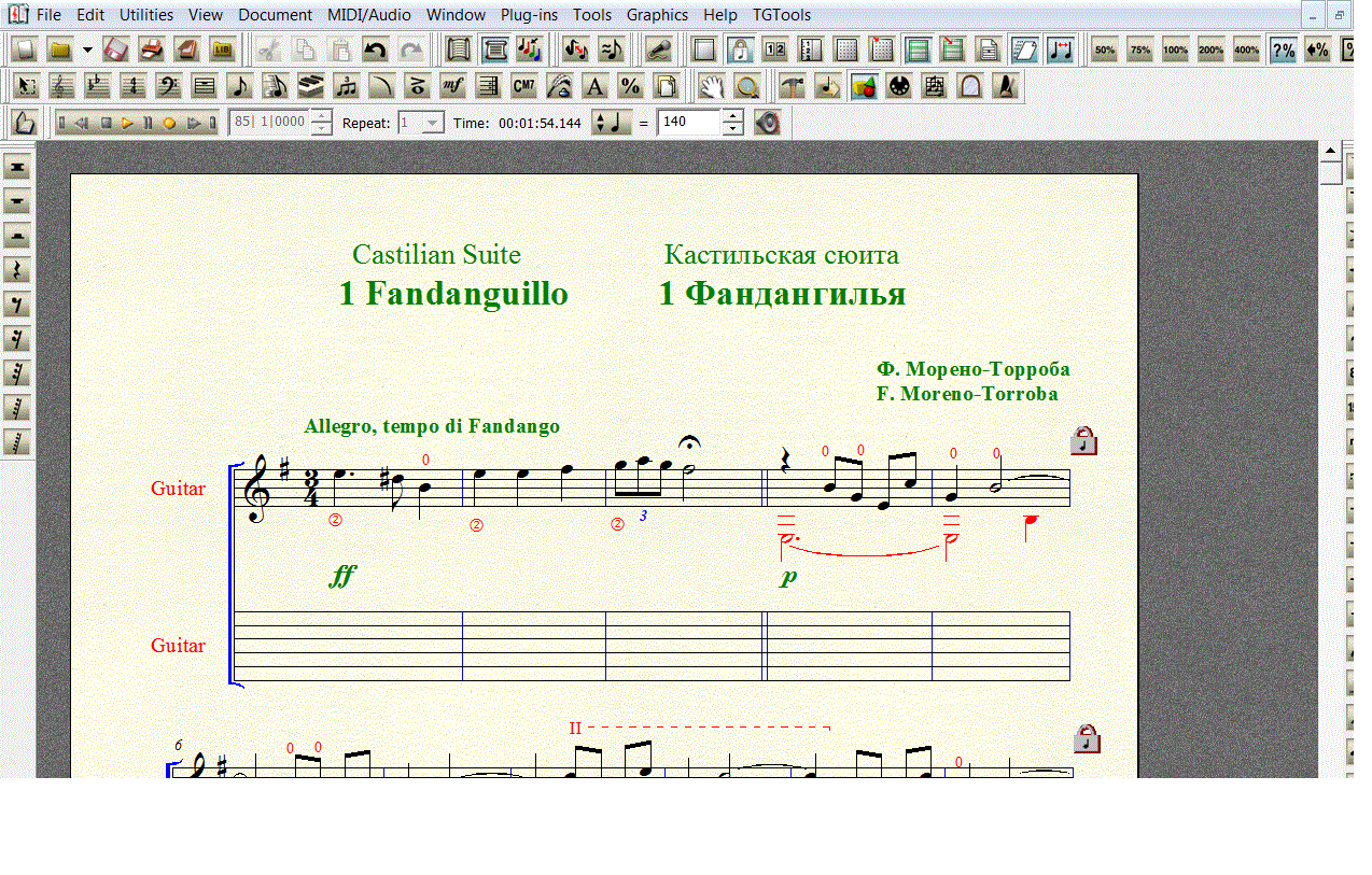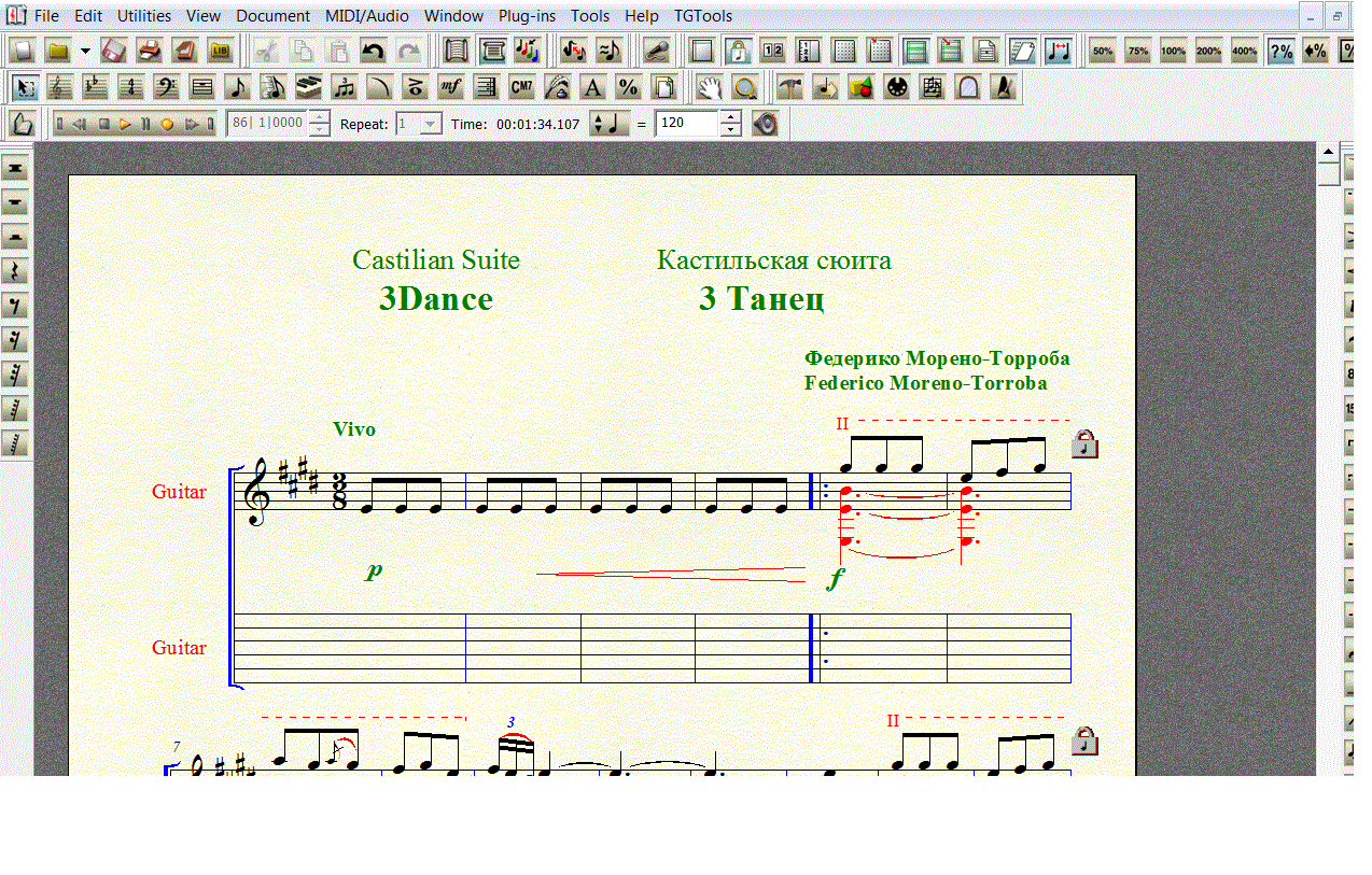 Для 6-й гитары в формате FINALE 2008 (расширение .mus). Под нотной строкой добавлена таблатурная строка, что бы вы сами могли создать и редактировать собственную «распальцовку».