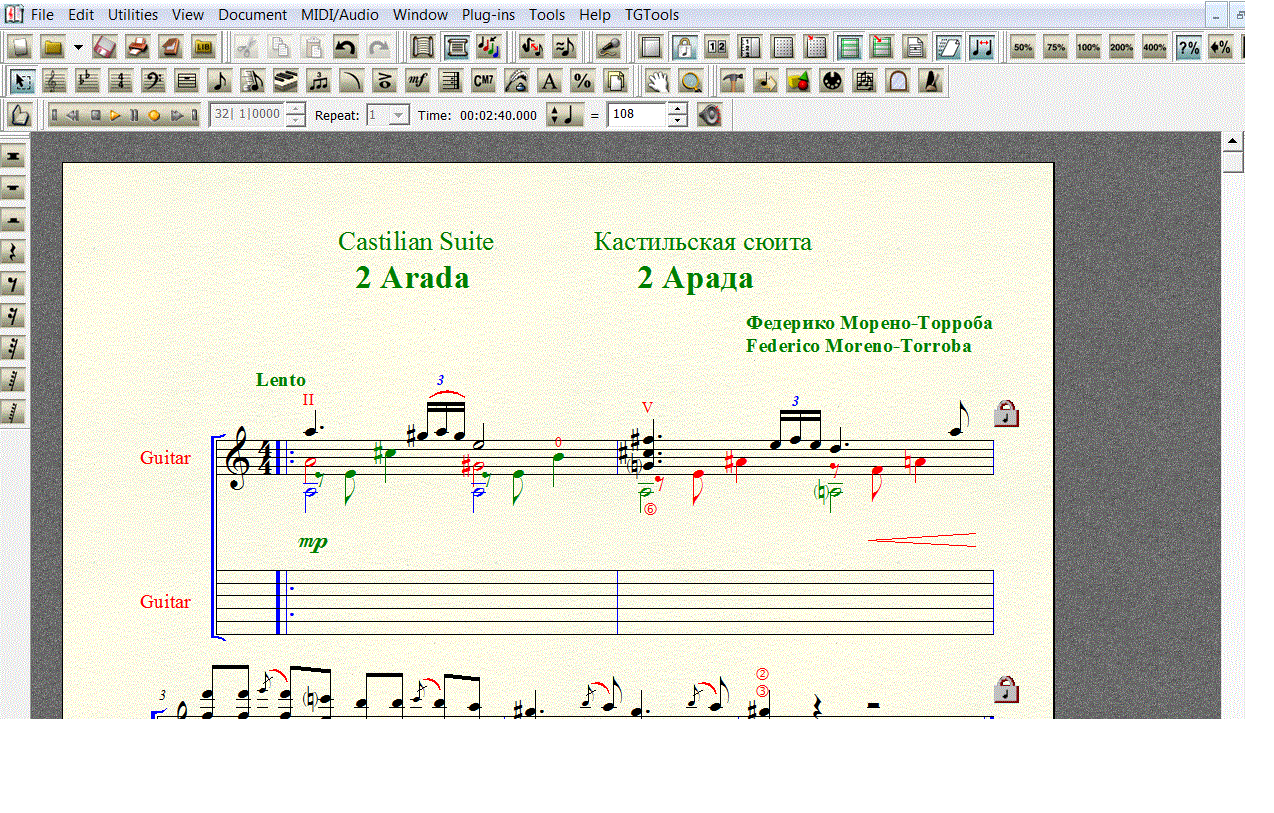 Под нотной строкой добавлена таблатурная строка, чтобы вы могли сами создавать и редактировать "распальцовку".