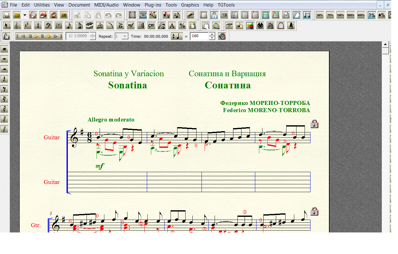 Под нотной строкой добавлена таблатурная строка, чтобы вы могли сами создавать и редактировать "распальцовку".
