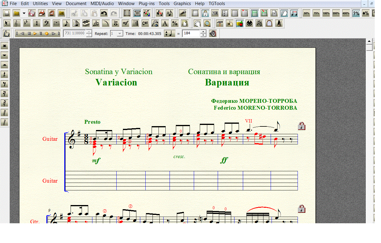 Для 6-й гитары в формате FINALE 2008 (расширение .mus). Под нотной строкой добавлена таблатурная строка, что бы вы сами могли создать и редактировать собственную «распальцовку».