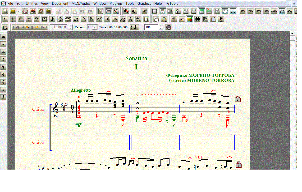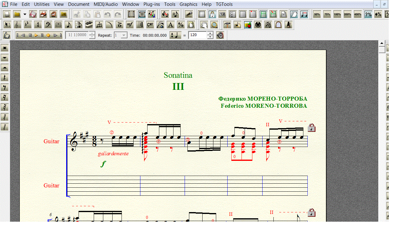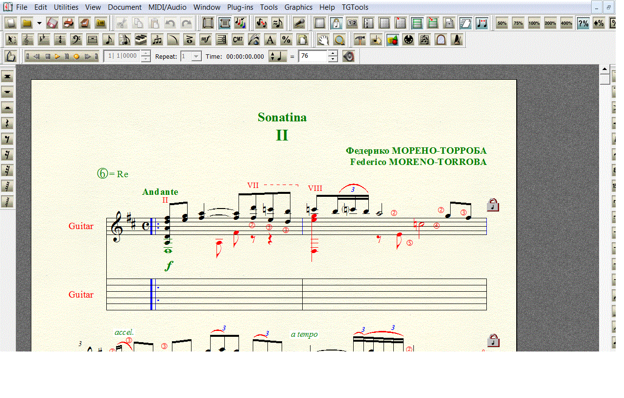 Под нотной строкой добавлена таблатурная строка, чтобы вы могли сами создавать и редактировать "распальцовку".