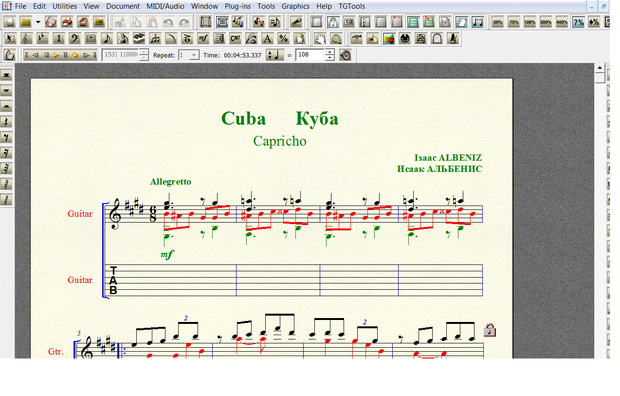 Нотный набор выполнен в FINALE 2008 (расширение .mus). Под нотной строкой добавлена таблатурная строка, что бы вы сами могли создать и редактировать собственную «распальцовку».