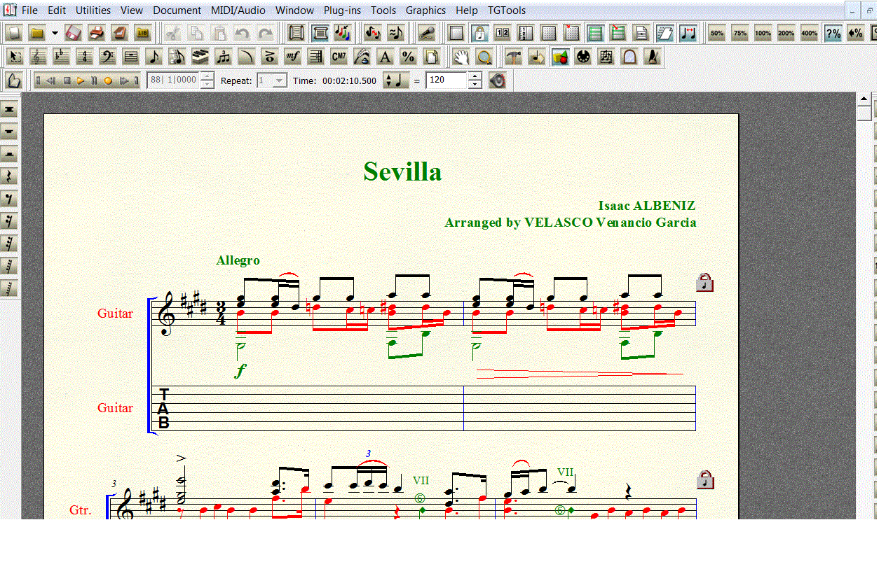 Нотный набор выполнен в FINALE 2008 (расширение .mus). Под нотной строкой добавлена таблатурная строка, что бы вы сами могли создать и редактировать собственную «распальцовку».