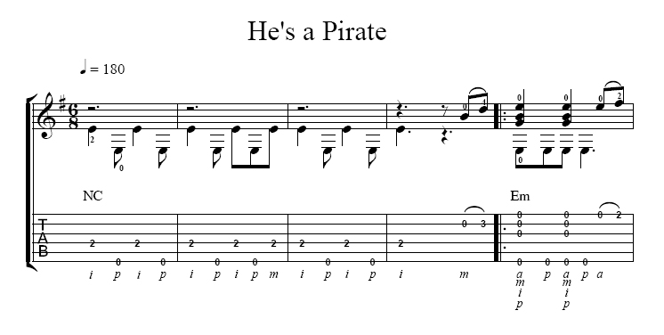 ТАБУЛАТУРА и ноты саундтрека к фильму «Пираты карибского моря» («Pirates of the Caribbean») для одной гитары.