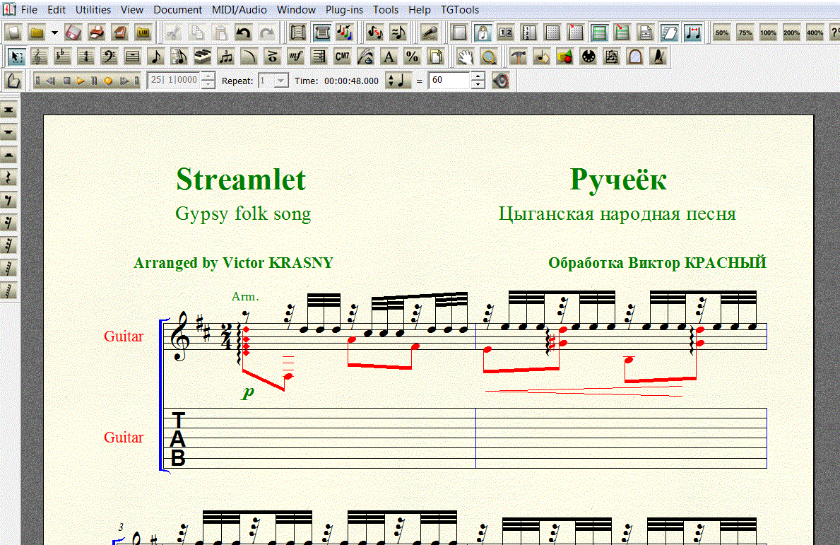 Под нотной строкой добавлена таблатурная строка, что бы вы сами могли создать и редактировать собственную «распальцовку».