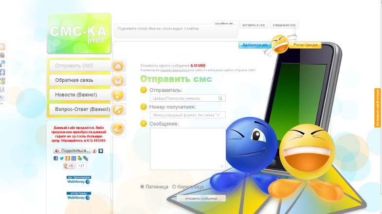 - Интеграция с шлюзом отправки смс-сообщений (сайт, после регистрации на котором Вы связываете свой скрипт с ним. Лично я плачу за СМС 5 центов, отправка на моем ресурсе по 15. Вы сами устанавливаете стоимость 1-го сообщения для пользователей, а также комиссию для той или иной валюты и платежной системы отдельно)