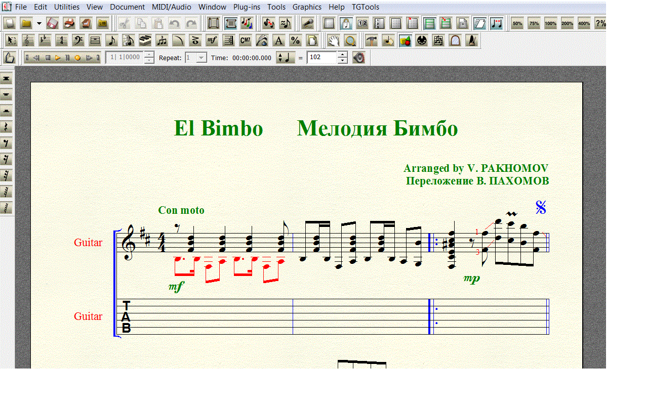 Я принципиально сохранил аппликатуру В. Пахомова, но, для проформы, под нотной строкой добавил таблатурную строку, что бы вы сами могли создать и редактировать собственную «распальцовку».