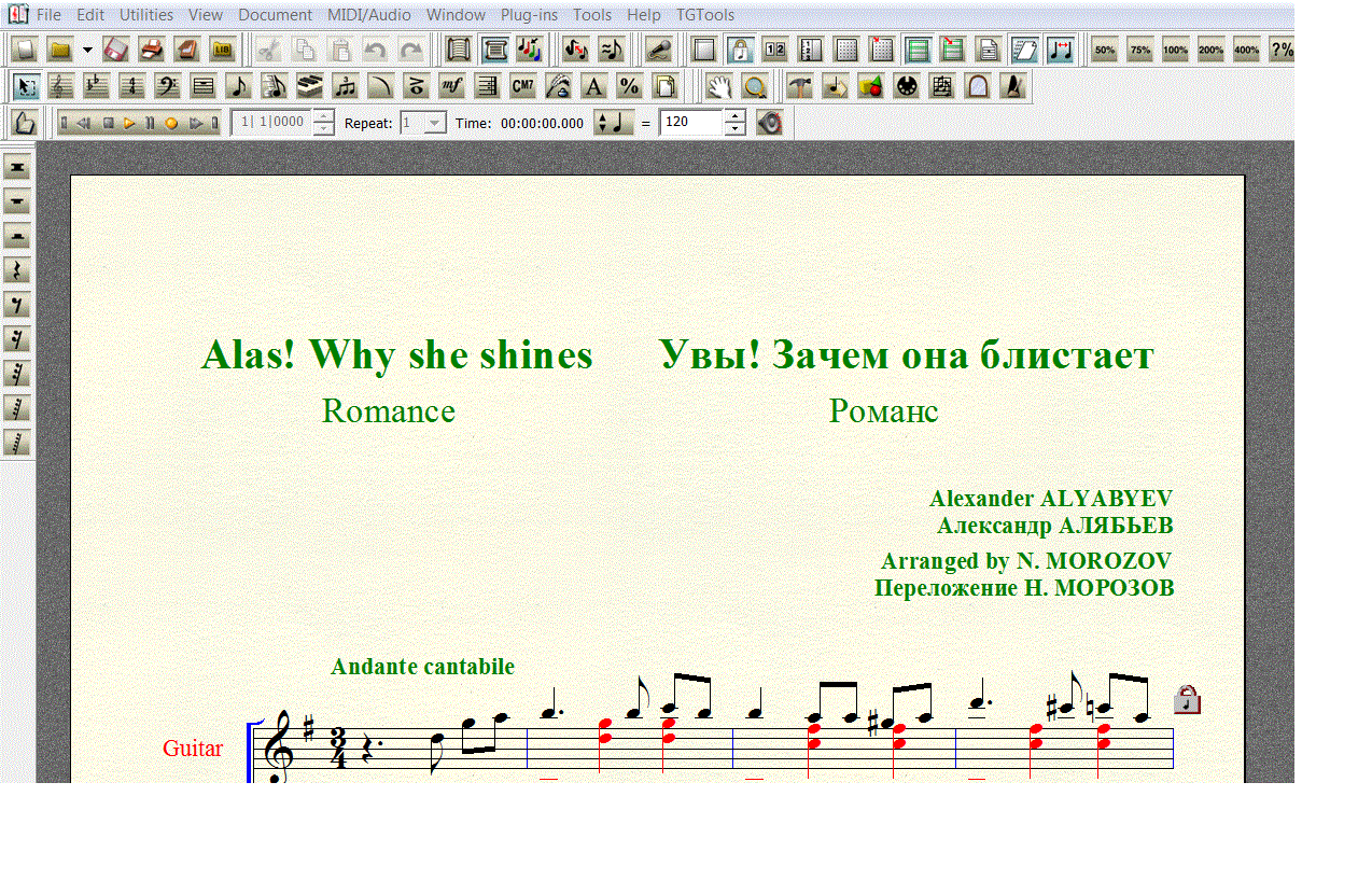 Нотный набор выполнен в FINALE 2008 (расширение .mus). Под нотной строкой добавлена таблатурная строка, что бы вы сами могли создать и редактировать собственную «распальцовку».