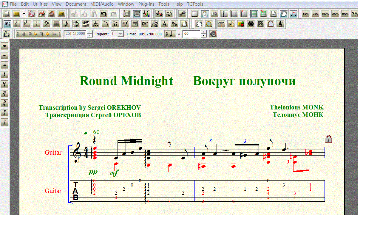 Телониус Монк (MONK, Sphere Thelonious 1917 - 1982), джазовая тема ВОКРУГ ПОЛУНОЧИ (Round Midnight). Переложение для 6-ой гитары. Нотный набор выполнен в FINALE 2008 (расширение .mus). С ТАБОЙ!