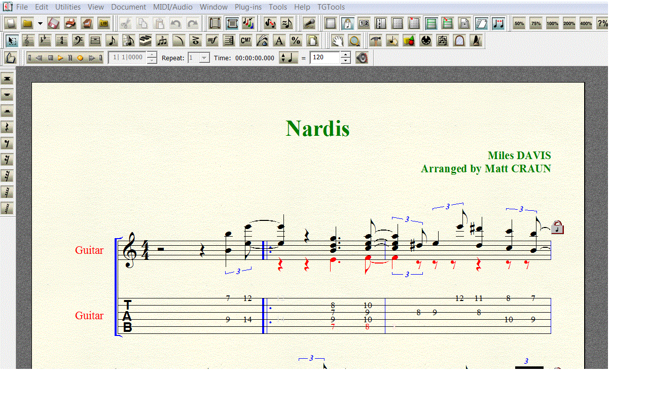 Майлс Дэйвис (DAVIS, Miles Dewey 1926 - 1991), джазовая тема NARDIS. Переложение для 6-ой гитары. Нотный набор выполнен в FINALE 2008 (расширение .mus). С ТАБОЙ!