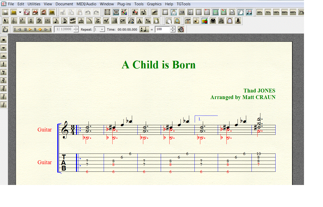 Тэд Джонс (JONES, Thad (Thaddeus Joseph) 1923 – 1986), джазовая тема A CHILD IS BORN (процветает «вольный» перевод этого названия). Переложение для 6-ой гитары. Нотный набор выполнен в FINALE 2008 (расширение .mus). С ТАБУЛАТУРОЙ!