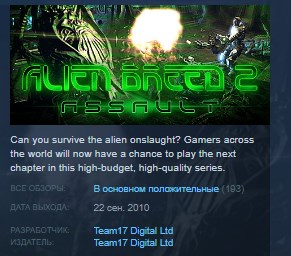 Удастся ли вам пережить нападение инопланетян? Alien Breed™ 2: Assault - вторая глава в серии Alien Breed™. Это взрывной аркадный шутер в стилистике научной фантастики, который включает захватывающий сюжет, орды сверхразумных инопланетных врагов, мощное оружие и потрясающие, невероятно детализированные пейзажи, созданные на основе движка Unreal® Engine 3 от Epic Games. Управляйте героем - старшим инженером корабля Конрадом - и продолжите борьбу за выживание на обреченном космическом судне, сражаясь с безжалостными инопланетными ордами. Единственная ваша надежда - вновь пробудить чудовищные двигатели инопланетного корабля, чтобы спастись от почти неизбежного уничтожения. Спуститесь в глубины незнакомого вам судна и, пока время стремительно истекает, готовьте оружие и начинайте с боем прорываться сквозь тьму ради того, чтобы выжить. Но знайте: вы не одни. Это судно - дом не только для кровожадной инопланетной орды, но и для кое-чего еще… Того, чему еще предстоит открыть свои истинные намерения… Того, что пока выжидает. Вдобавок к захватывающей кампании для одного игрока и нового режима «Выживание», игра также предлагает жестокие, насыщенные боями совместные сетевые режимы игры для двух игроков.