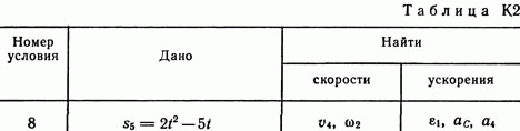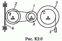 Решение задачи К2 Вариант 08: Механизм состоит из ступенчатых колес 1—3, находящихся в зацеплении или связанных ременной передачей, зубчатой рейки 4 и груза 5, привязанного к концу нити, намотанной на одно из колес (рис. К2.0, табл. К2). Радиусы ступеней колес равны соответственно: у колеса 1 – r1 = 2 см, R1 = 4 см, у колеса 2 – r2 = 6 см, R2 = 8 см, у колеса 3 – r3 — 12 см, R3 = 16 см. На ободьях колес расположены точки A, В и С. В столбце «Дано» таблицы указан закон движения или закон изменения скорости ведущего звена механизма, где φ1(t) — закон вращения колеса 1, s2(f) — закон движения рейки 4, ω2(t) — закон изменения угловой скорости колеса 2, v5(t) — закон изменения скорости груза 5 и т. д. (везде φ выражено в радианах, s — в сантиметрах, t — в секундах). Положительное направление для φ и ω против хода часовой стрелки, для s4, s5 и v4, v5 — вниз. Определить в момент времени t1 = 2 с указанные в таблице в столбцах «Найти» скорости (v — линейные, ω — угловые) и ускорения (а — линейные, ε — угловые) соответствующих точек или тел (v5 — скорость груза 5 и т. д.).