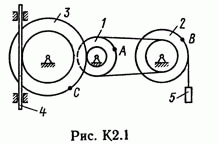 Решение задачи К2 Вариант 10: Механизм состоит из ступенчатых колес 1—3, находящихся в зацеплении или связанных ременной передачей, зубчатой рейки 4 и груза 5, привязанного к концу нити, намотанной на одно из колес (рис. К2.1, табл. К2). Радиусы ступеней колес равны соответственно: у колеса 1 – r1 = 2 см, R1 = 4 см, у колеса 2 – r2 = 6 см, R2 = 8 см, у колеса 3 – r3 — 12 см, R3 = 16 см. На ободьях колес расположены точки A, В и С. В столбце «Дано» таблицы указан закон движения или закон изменения скорости ведущего звена механизма, где φ1(t) — закон вращения колеса 1, s2(f) — закон движения рейки 4, ω2(t) — закон изменения угловой скорости колеса 2, v5(t) — закон изменения скорости груза 5 и т. д. (везде φ выражено в радианах, s — в сантиметрах, t — в секундах). Положительное направление для φ и ω против хода часовой стрелки, для s4, s5 и v4, v5 — вниз. Определить в момент времени t1 = 2 с указанные в таблице в столбцах «Найти» скорости (v — линейные, ω — угловые) и ускорения (а — линейные, ε — угловые) соответствующих точек или тел (v5 — скорость груза 5 и т. д.).