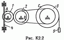 Решение задачи К2 Вариант 29: Механизм состоит из ступенчатых колес 1—3, находящихся в зацеплении или связанных ременной передачей, зубчатой рейки 4 и груза 5, привязанного к концу нити, намотанной на одно из колес (рис. К2.2, табл. К2). Радиусы ступеней колес равны соответственно: у колеса 1 – r1 = 2 см, R1 = 4 см, у колеса 2 – r2 = 6 см, R2 = 8 см, у колеса 3 – r3 — 12 см, R3 = 16 см. На ободьях колес расположены точки A, В и С. В столбце «Дано» таблицы указан закон движения или закон изменения скорости ведущего звена механизма, где φ1(t) — закон вращения колеса 1, s2(f) — закон движения рейки 4, ω2(t) — закон изменения угловой скорости колеса 2, v5(t) — закон изменения скорости груза 5 и т. д. (везде φ выражено в радианах, s — в сантиметрах, t — в секундах). Положительное направление для φ и ω против хода часовой стрелки, для s4, s5 и v4, v5 — вниз. Определить в момент времени t1 = 2 с указанные в таблице в столбцах «Найти» скорости (v — линейные, ω — угловые) и ускорения (а — линейные, ε — угловые) соответствующих точек или тел (v5 — скорость груза 5 и т. д.).