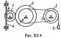 Решение задачи К2 Вариант 49: Механизм состоит из ступенчатых колес 1—3, находящихся в зацеплении или связанных ременной передачей, зубчатой рейки 4 и груза 5, привязанного к концу нити, намотанной на одно из колес (рис. К2.4, табл. К2). Радиусы ступеней колес равны соответственно: у колеса 1 – r1 = 2 см, R1 = 4 см, у колеса 2 – r2 = 6 см, R2 = 8 см, у колеса 3 – r3 — 12 см, R3 = 16 см. На ободьях колес расположены точки A, В и С. В столбце «Дано» таблицы указан закон движения или закон изменения скорости ведущего звена механизма, где ф1(t) — закон вращения колеса 1, s2(f) — закон движения рейки 4, w2(t) — закон изменения угловой скорости колеса 2, v5(t) — закон изменения скорости груза 5 и т. д. (везде ф выражено в радианах, s — в сантиметрах, t — в секундах). Положительное направление для ф и w против хода часовой стрелки, для s4, s5 и v4, v5 — вниз. Определить в момент времени t1 = 2 с указанные в таблице в столбцах «Найти» скорости (v — линейные, w — угловые) и ускорения (а — линейные, e — угловые) соответствующих точек или тел (v5 — скорость груза 5 и т. д.).