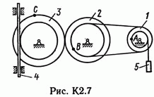 Решение задачи К2 Вариант 76: Механизм состоит из ступенчатых колес 1—3, находящихся в зацеплении или связанных ременной передачей, зубчатой рейки 4 и груза 5, привязанного к концу нити, намотанной на одно из колес (рис. К2.7, табл. К2). Радиусы ступеней колес равны соответственно: у колеса 1 – r1 = 2 см, R1 = 4 см, у колеса 2 – r2 = 6 см, R2 = 8 см, у колеса 3 – r3 — 12 см, R3 = 16 см. На ободьях колес расположены точки A, В и С. В столбце «Дано» таблицы указан закон движения или закон изменения скорости ведущего звена механизма, где ф1(t) — закон вращения колеса 1, s2(f) — закон движения рейки 4, w2(t) — закон изменения угловой скорости колеса 2, v5(t) — закон изменения скорости груза 5 и т. д. (везде ф выражено в радианах, s — в сантиметрах, t — в секундах). Положительное направление для ф и w против хода часовой стрелки, для s4, s5 и v4, v5 — вниз. Определить в момент времени t1 = 2 с указанные в таблице в столбцах «Найти» скорости (v — линейные, w — угловые) и ускорения (а — линейные, e — угловые) соответствующих точек или тел (v5 — скорость груза 5 и т. д.).