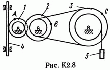 Решение задачи К2 Вариант 86: Механизм состоит из ступенчатых колес 1—3, находящихся в зацеплении или связанных ременной передачей, зубчатой рейки 4 и груза 5, привязанного к концу нити, намотанной на одно из колес (рис. К2.8, табл. К2). Радиусы ступеней колес равны соответственно: у колеса 1 – r1 = 2 см, R1 = 4 см, у колеса 2 – r2 = 6 см, R2 = 8 см, у колеса 3 – r3 — 12 см, R3 = 16 см. На ободьях колес расположены точки A, В и С. В столбце «Дано» таблицы указан закон движения или закон изменения скорости ведущего звена механизма, где ф1(t) — закон вращения колеса 1, s2(f) — закон движения рейки 4, w2(t) — закон изменения угловой скорости колеса 2, v5(t) — закон изменения скорости груза 5 и т. д. (везде ф выражено в радианах, s — в сантиметрах, t — в секундах). Положительное направление для ф и w против хода часовой стрелки, для s4, s5 и v4, v5 — вниз. Определить в момент времени t1 = 2 с указанные в таблице в столбцах «Найти» скорости (v — линейные, w — угловые) и ускорения (а — линейные, e — угловые) соответствующих точек или тел (v5 — скорость груза 5 и т. д.).