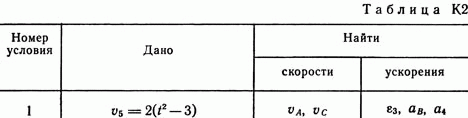 Решение задачи К2 Вариант 91: Механизм состоит из ступенчатых колес 1—3, находящихся в зацеплении или связанных ременной передачей, зубчатой рейки 4 и груза 5, привязанного к концу нити, намотанной на одно из колес (рис. К2.9, табл. К2). Радиусы ступеней колес равны соответственно: у колеса 1 – r1 = 2 см, R1 = 4 см, у колеса 2 – r2 = 6 см, R2 = 8 см, у колеса 3 – r3 — 12 см, R3 = 16 см. На ободьях колес расположены точки A, В и С. В столбце «Дано» таблицы указан закон движения или закон изменения скорости ведущего звена механизма, где ф1(t) — закон вращения колеса 1, s2(f) — закон движения рейки 4, w2(t) — закон изменения угловой скорости колеса 2, v5(t) — закон изменения скорости груза 5 и т. д. (везде ф выражено в радианах, s — в сантиметрах, t — в секундах). Положительное направление для ф и w против хода часовой стрелки, для s4, s5 и v4, v5 — вниз. Определить в момент времени t1 = 2 с указанные в таблице в столбцах «Найти» скорости (v — линейные, w — угловые) и ускорения (а — линейные, e — угловые) соответствующих точек или тел (v5 — скорость груза 5 и т. д.).