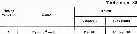 Решение задачи К2 Вариант 97: Механизм состоит из ступенчатых колес 1—3, находящихся в зацеплении или связанных ременной передачей, зубчатой рейки 4 и груза 5, привязанного к концу нити, намотанной на одно из колес (рис. К2.9, табл. К2). Радиусы ступеней колес равны соответственно: у колеса 1 – r1 = 2 см, R1 = 4 см, у колеса 2 – r2 = 6 см, R2 = 8 см, у колеса 3 – r3 — 12 см, R3 = 16 см. На ободьях колес расположены точки A, В и С. В столбце «Дано» таблицы указан закон движения или закон изменения скорости ведущего звена механизма, где ф1(t) — закон вращения колеса 1, s2(f) — закон движения рейки 4, w2(t) — закон изменения угловой скорости колеса 2, v5(t) — закон изменения скорости груза 5 и т. д. (везде ф выражено в радианах, s — в сантиметрах, t — в секундах). Положительное направление для ф и w против хода часовой стрелки, для s4, s5 и v4, v5 — вниз. Определить в момент времени t1 = 2 с указанные в таблице в столбцах «Найти» скорости (v — линейные, w — угловые) и ускорения (а — линейные, e — угловые) соответствующих точек или тел (v5 — скорость груза 5 и т. д.).