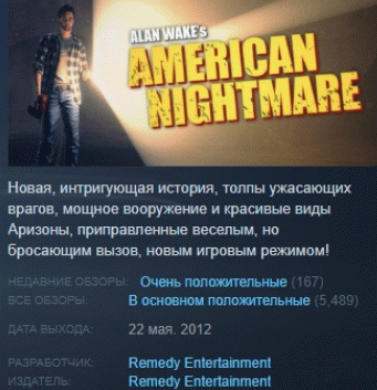 В этот раз Алан Уэйк сразится с мистером Скрэтчем, вестником тьмы! Новый захватывающий сюжет, орды ужасающих врагов, серьезное оружие и прекрасные пейзажи Аризоны, а также увлекательный новый режим станут настоящим подарком для фанатов Алана Уэйка, а для всех остальных — отличной возможностью познакомиться с историей писателя.