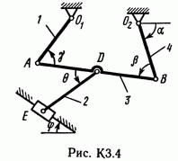 Решение задачи К3 Вариант 41. Задание: Плоский механизм состоит из стержней 1, 2, 3, 4 и ползуна В или Е (рис. КЗ.0 — К3.7) или из стержней 1, 2, 3 и ползунов В и E (рис. К3.8, К3.9), соединенных друг с другом и с неподвижными опорами O1, O2 шарнирами; точка D находится в середине стержня АВ. Длины стержней равны соответственно l1 = 0,4 м, l1 = 1,2 м, l3 = 1,4 м, l4 = 0,6 м. Положение механизма определяется углами α, β, γ, φ, θ. Значения этих углов и других заданных величин указаны в табл. КЗа (для рис. 0—4) или в табл. КЗб (для рис. 5—9); при этом в табл. КЗа ω1 и ω4 — величины постоянные. Определить величины, указанные в таблицах в столбцах «Найти». Дуговые стрелки на рисунках показывают, как при построении чертежа механизма должны откладываться соответствующие углы: по ходу или против хода часовой стрелки (например, угол γ на рис. 8 следует отложить от DB по ходу часовой стрелки, а на рис. 9 — против хода часовой стрелки и т. д.). Построение чертежа начинать со стержня, направление которого определяется углом α; ползун с направляющими для большей наглядности изобразить так, как в примере КЗ (см. рис. КЗб). Заданные угловую скорость и угловое ускорение считать направ¬ленными против часовой стрелки, а заданные скорость vB и ускорение аB — от точки В к b (на рис. 5—9).