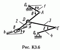 Решение задачи К3 Вариант 66. Задание: Плоский механизм состоит из стержней 1, 2, 3, 4 и ползуна В или Е (рис. КЗ.0 — К3.7) или из стержней 1, 2, 3 и ползунов В и E (рис. К3.8, К3.9), соединенных друг с другом и с неподвижными опорами O1, O2 шарнирами; точка D находится в середине стержня АВ. Длины стержней равны соответственно l1 = 0,4 м, l1 = 1,2 м, l3 = 1,4 м, l4 = 0,6 м. Положение механизма определяется углами α, β, γ, φ, θ. Значения этих углов и других заданных величин указаны в табл. КЗа (для рис. 0—4) или в табл. КЗб (для рис. 5—9); при этом в табл. КЗа ω1 и ω4 — величины постоянные. Определить величины, указанные в таблицах в столбцах «Найти». Дуговые стрелки на рисунках показывают, как при построении чертежа механизма должны откладываться соответствующие углы: по ходу или против хода часовой стрелки (например, угол γ на рис. 8 следует отложить от DB по ходу часовой стрелки, а на рис. 9 — против хода часовой стрелки и т. д.). Построение чертежа начинать со стержня, направление которого определяется углом α; ползун с направляющими для большей наглядности изобразить так, как в примере КЗ (см. рис. КЗб). Заданные угловую скорость и угловое ускорение считать направленными против часовой стрелки, а заданные скорость vB и ускорение аB — от точки В к b (на рис. 5—9).