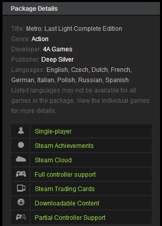 Включенные товары (7): Metro: Last Light, Metro: Last Light - Chronicles Pack, Metro: Last Light - Developer Pack, Metro: Last Light - Faction Pack, Metro: Last Light - Ranger Mode, Metro: Last Light - RPK, Metro: Last Light - Tower Pack