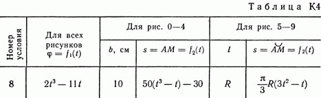 Решение контрольной К4 Вариант 58. Задание для задачи К4: Прямоугольная пластина (рис. К4.0 — К4.4) или круглая пластина радиуса R = 60 см (рис. К4.5 — К4.9) вращается вокруг неподвижной оси по закону фи = f1(t), заданному в табл. К4. Положительное направление отсчета угла фи показано на рисунках дуговой стрелкой. На рис. 0, 1, 2, 5, 6 ось вращения перпендикулярна плоскости пластины и проходит через точку О (пластина вращается в своей плоскости); на рис. 3, 4, 7, 8, 9 ось вращения OO1 лежит в плоскости пластины (пластина вращается в пространстве). По пластине вдоль прямой BD (рис. 0—4) или по окружности радиуса R (рис. 5—9) движется точка М; закон относительного движения, т.е. зависимость s = AM = f2(t) (s выражена в сантиметрах, t — в секундах), задан в таблице отдельно для рис. 0—4 и для рис. 5—9; там же даны размеры b и l. На всех рисунках точка М показана в положении, при котором s = АМ>0 (при s<0 точка М находится по другую сторону от точки А). Необходимо найти абсолютную скорость и абсолютное ускорение точки М в момент времени t1 = 1 с.
