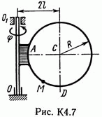 Решение контрольной К4 Вариант 72. Задание для задачи К4: Прямоугольная пластина (рис. К4.0 — К4.4) или круглая пластина радиуса R = 60 см (рис. К4.5 — К4.9) вращается вокруг неподвижной оси по закону фи = f1(t), заданному в табл. К4. Положительное направление отсчета угла фи показано на рисунках дуговой стрелкой. На рис. 0, 1, 2, 5, 6 ось вращения перпендикулярна плоскости пластины и проходит через точку О (пластина вращается в своей плоскости); на рис. 3, 4, 7, 8, 9 ось вращения OO1 лежит в плоскости пластины (пластина вращается в пространстве). По пластине вдоль прямой BD (рис. 0—4) или по окружности радиуса R (рис. 5—9) движется точка М; закон относительного движения, т.е. зависимость s = AM = f2(t) (s выражена в сантиметрах, t — в секундах), задан в таблице отдельно для рис. 0—4 и для рис. 5—9; там же даны размеры b и l. На всех рисунках точка М показана в положении, при котором s = АМ>0 (при s<0 точка М находится по другую сторону от точки А). Необходимо найти абсолютную скорость и абсолютное ускорение точки М в момент времени t1 = 1 с.