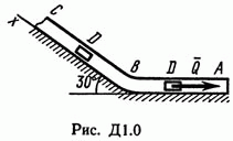 Решение Д1 В01. Условие задачи: Груз D массой m, получив в точке A начальную скорость v0 движется в изогнутой трубе AВС, расположенной в вертикальной плоскости; участки трубы или оба наклонные, или один горизонтальный, а другой наклонный (рис. Д1.0 — Д1.9, табл. Д1). На участке AВ на груз кроме силы тяжести действуют постоянная сила Q (ее направление показано на рисунках) и сила сопротивления среды R, зависящая от скорости v груза (направлена против движения); трением груза о трубу на участке AВ пренебречь. В точке В груз, не изменяя своей скорости, переходит на участок ВС трубы, где на него кроме силы тяжести действуют сила трения (коэффициент трения груза о трубу f = 0,2) и переменная сила F, проекция которой Fx на ось х задана в таблице. Считая груз материальной точкой и зная расстояние AВ = l или время t1 движения груза от точки А до точки В, найти закон движения груза на участке ВС, т. е. х = f(t), где х = BD.
