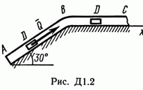 Решение Д1 В25. Условие задачи: Груз D массой m, получив в точке A начальную скорость v0 движется в изогнутой трубе AВС, расположенной в вертикальной плоскости; участки трубы или оба наклонные, или один горизонтальный, а другой наклонный (рис. Д1.0 — Д1.9, табл. Д1). На участке AВ на груз кроме силы тяжести действуют постоянная сила Q (ее направление показано на рисунках) и сила сопротивления среды R, зависящая от скорости v груза (направлена против движения); трением груза о трубу на участке AВ пренебречь. В точке В груз, не изменяя своей скорости, переходит на участок ВС трубы, где на него кроме силы тяжести действуют сила трения (коэффициент трения груза о трубу f = 0,2) и переменная сила F, проекция которой Fx на ось х задана в таблице. Считая груз материальной точкой и зная расстояние AВ = l или время t1 движения груза от точки А до точки В, найти закон движения груза на участке ВС, т. е. х = f(t), где х = BD.