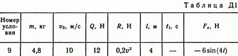 Решение Д1 В29. Условие задачи: Груз D массой m, получив в точке A начальную скорость v0 движется в изогнутой трубе AВС, расположенной в вертикальной плоскости; участки трубы или оба наклонные, или один горизонтальный, а другой наклонный (рис. Д1.0 — Д1.9, табл. Д1). На участке AВ на груз кроме силы тяжести действуют постоянная сила Q (ее направление показано на рисунках) и сила сопротивления среды R, зависящая от скорости v груза (направлена против движения); трением груза о трубу на участке AВ пренебречь. В точке В груз, не изменяя своей скорости, переходит на участок ВС трубы, где на него кроме силы тяжести действуют сила трения (коэффициент трения груза о трубу f = 0,2) и переменная сила F, проекция которой Fx на ось х задана в таблице. Считая груз материальной точкой и зная расстояние AВ = l или время t1 движения груза от точки А до точки В, найти закон движения груза на участке ВС, т. е. х = f(t), где х = BD.
