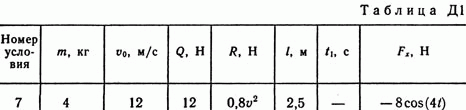 Решение Д1 В57. Условие задачи: Груз D массой m, получив в точке A начальную скорость v0 движется в изогнутой трубе AВС, расположенной в вертикальной плоскости; участки трубы или оба наклонные, или один горизонтальный, а другой наклонный (рис. Д1.0 — Д1.9, табл. Д1). На участке AВ на груз кроме силы тяжести действуют постоянная сила Q (ее направление показано на рисунках) и сила сопротивления среды R, зависящая от скорости v груза (направлена против движения); трением груза о трубу на участке AВ пренебречь. В точке В груз, не изменяя своей скорости, переходит на участок ВС трубы, где на него кроме силы тяжести действуют сила трения (коэффициент трения груза о трубу f = 0,2) и переменная сила F, проекция которой Fx на ось х задана в таблице. Считая груз материальной точкой и зная расстояние AВ = l или время t1 движения груза от точки А до точки В, найти закон движения груза на участке ВС, т. е. х = f(t), где х = BD.