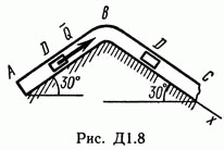 Решение Д1 В80. Условие задачи: Груз D массой m, получив в точке A начальную скорость v0 движется в изогнутой трубе AВС, расположенной в вертикальной плоскости; участки трубы или оба наклонные, или один горизонтальный, а другой наклонный (рис. Д1.0 — Д1.9, табл. Д1). На участке AВ на груз кроме силы тяжести действуют постоянная сила Q (ее направление показано на рисунках) и сила сопротивления среды R, зависящая от скорости v груза (направлена против движения); трением груза о трубу на участке AВ пренебречь. В точке В груз, не изменяя своей скорости, переходит на участок ВС трубы, где на него кроме силы тяжести действуют сила трения (коэффициент трения груза о трубу f = 0,2) и переменная сила F, проекция которой Fx на ось х задана в таблице. Считая груз материальной точкой и зная расстояние AВ = l или время t1 движения груза от точки А до точки В, найти закон движения груза на участке ВС, т. е. х = f(t), где х = BD.