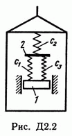 Решение Д2 В22. Условие задачи: Груз 1 массой m укреплен на пружинной подвеске в лифте (рис. Д2.0 — Д2.9, табл. Д2). Лифт движется вертикально по закону z = 0,5α1t2 + α2sin(wt) + α3cos(wt) (ось z направлена по вертикали вверх; z выражено в метрах, t — в секундах). На груз действует сила сопротивления среды R = μv, где v — скорость груза по отношению к лифту. Найти закон движения груза по отношению к лифту, т. е. х = f(t); начало координат поместить в точке, где находится прикрепленный к грузу конец пружины, когда пружина не деформирована. При этом во избежание ошибок в знаках направить ось х в сторону удлинения пружины, а груз изобразить в положении, при котором х>0, т.е. пружина растянута. При подсчетах можно принять g = 10 м/с2. Массой пружин и соединительной планки 2 пренебречь. В таблице обозначено: c1, с2, c3 — коэффициенты жесткости пружин, L0 — удлинение пружины с эквивалентной жесткостью в начальный момент времени t = 0, v0 — начальная скорость груза по отношению к лифту (направлена вертикально вверх). Прочерк в столбцах c1, c2, c3 означает, что соответствующая пружина отсутствует и на чертеже изображаться не должна. Если при этом конец одной из оставшихся пружин окажется свободным, его следует прикрепить в соответствующем месте или к грузу или к потолку (полу) лифта; то же следует сделать, если свободными окажутся соединенные планкой 2 концы обеих оставшихся пружин. Условие u = 0 означает, что сила сопротивления R отсутствует.