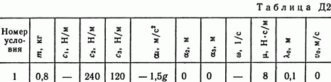 Решение Д2 В41. Условие задачи: Груз 1 массой m укреплен на пружинной подвеске в лифте (рис. Д2.0 — Д2.9, табл. Д2). Лифт движется вертикально по закону z = 0,5α1t2 + α2sin(wt) + α3cos(wt) (ось z направлена по вертикали вверх; z выражено в метрах, t — в секундах). На груз действует сила сопротивления среды R = μv, где v — скорость груза по отношению к лифту. Найти закон движения груза по отношению к лифту, т. е. х = f(t); начало координат поместить в точке, где находится прикрепленный к грузу конец пружины, когда пружина не деформирована. При этом во избежание ошибок в знаках направить ось х в сторону удлинения пружины, а груз изобразить в положении, при котором х>0, т.е. пружина растянута. При подсчетах можно принять g = 10 м/с2. Массой пружин и соединительной планки 2 пренебречь. В таблице обозначено: c1, с2, c3 — коэффициенты жесткости пружин, L0 — удлинение пружины с эквивалентной жесткостью в начальный момент времени t = 0, v0 — начальная скорость груза по отношению к лифту (направлена вертикально вверх). Прочерк в столбцах c1, c2, c3 означает, что соответствующая пружина отсутствует и на чертеже изображаться не должна. Если при этом конец одной из оставшихся пружин окажется свободным, его следует прикрепить в соответствующем месте или к грузу или к потолку (полу) лифта; то же следует сделать, если свободными окажутся соединенные планкой 2 концы обеих оставшихся пружин. Условие u = 0 означает, что сила сопротивления R отсутствует.