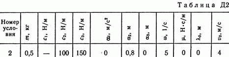 Решение Д2 В42. Условие задачи: Груз 1 массой m укреплен на пружинной подвеске в лифте (рис. Д2.0 — Д2.9, табл. Д2). Лифт движется вертикально по закону z = 0,5α1t2 + α2sin(wt) + α3cos(wt) (ось z направлена по вертикали вверх; z выражено в метрах, t — в секундах). На груз действует сила сопротивления среды R = μv, где v — скорость груза по отношению к лифту. Найти закон движения груза по отношению к лифту, т. е. х = f(t); начало координат поместить в точке, где находится прикрепленный к грузу конец пружины, когда пружина не деформирована. При этом во избежание ошибок в знаках направить ось х в сторону удлинения пружины, а груз изобразить в положении, при котором х>0, т.е. пружина растянута. При подсчетах можно принять g = 10 м/с2. Массой пружин и соединительной планки 2 пренебречь. В таблице обозначено: c1, с2, c3 — коэффициенты жесткости пружин, L0 — удлинение пружины с эквивалентной жесткостью в начальный момент времени t = 0, v0 — начальная скорость груза по отношению к лифту (направлена вертикально вверх). Прочерк в столбцах c1, c2, c3 означает, что соответствующая пружина отсутствует и на чертеже изображаться не должна. Если при этом конец одной из оставшихся пружин окажется свободным, его следует прикрепить в соответствующем месте или к грузу или к потолку (полу) лифта; то же следует сделать, если свободными окажутся соединенные планкой 2 концы обеих оставшихся пружин. Условие u = 0 означает, что сила сопротивления R отсутствует.