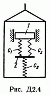 Решение Д2 В43. Условие задачи: Груз 1 массой m укреплен на пружинной подвеске в лифте (рис. Д2.0 — Д2.9, табл. Д2). Лифт движется вертикально по закону z = 0,5α1t2 + α2sin(wt) + α3cos(wt) (ось z направлена по вертикали вверх; z выражено в метрах, t — в секундах). На груз действует сила сопротивления среды R = μv, где v — скорость груза по отношению к лифту. Найти закон движения груза по отношению к лифту, т. е. х = f(t); начало координат поместить в точке, где находится прикрепленный к грузу конец пружины, когда пружина не деформирована. При этом во избежание ошибок в знаках направить ось х в сторону удлинения пружины, а груз изобразить в положении, при котором х>0, т.е. пружина растянута. При подсчетах можно принять g = 10 м/с2. Массой пружин и соединительной планки 2 пренебречь. В таблице обозначено: c1, с2, c3 — коэффициенты жесткости пружин, L0 — удлинение пружины с эквивалентной жесткостью в начальный момент времени t = 0, v0 — начальная скорость груза по отношению к лифту (направлена вертикально вверх). Прочерк в столбцах c1, c2, c3 означает, что соответствующая пружина отсутствует и на чертеже изображаться не должна. Если при этом конец одной из оставшихся пружин окажется свободным, его следует прикрепить в соответствующем месте или к грузу или к потолку (полу) лифта; то же следует сделать, если свободными окажутся соединенные планкой 2 концы обеих оставшихся пружин. Условие u = 0 означает, что сила сопротивления R отсутствует.