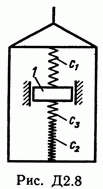 Решение Д2 В80. Условие задачи: Груз 1 массой m укреплен на пружинной подвеске в лифте (рис. Д2.0 — Д2.9, табл. Д2). Лифт движется вертикально по закону z = 0,5α1t2 + α2sin(wt) + α3cos(wt) (ось z направлена по вертикали вверх; z выражено в метрах, t — в секундах). На груз действует сила сопротивления среды R = μv, где v — скорость груза по отношению к лифту. Найти закон движения груза по отношению к лифту, т. е. х = f(t); начало координат поместить в точке, где находится прикрепленный к грузу конец пружины, когда пружина не деформирована. При этом во избежание ошибок в знаках направить ось х в сторону удлинения пружины, а груз изобразить в положении, при котором х>0, т.е. пружина растянута. При подсчетах можно принять g = 10 м/с2. Массой пружин и соединительной планки 2 пренебречь. В таблице обозначено: c1, с2, c3 — коэффициенты жесткости пружин, L0 — удлинение пружины с эквивалентной жесткостью в начальный момент времени t = 0, v0 — начальная скорость груза по отношению к лифту (направлена вертикально вверх). Прочерк в столбцах c1, c2, c3 означает, что соответствующая пружина отсутствует и на чертеже изображаться не должна. Если при этом конец одной из оставшихся пружин окажется свободным, его следует прикрепить в соответствующем месте или к грузу или к потолку (полу) лифта; то же следует сделать, если свободными окажутся соединенные планкой 2 концы обеих оставшихся пружин. Условие u = 0 означает, что сила сопротивления R отсутствует.