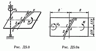 Д5 В03 - решение задачи по термеху из Тарга С.М. 1989 года. Условие к задаче Динамика 5: Однородная горизонтальная платформа (круглая радиуса R или прямоугольная со сторонами R и 2R, где R = 1,2 м) массой m1 = 24 кг вращается с угловой скоростью омега0 = 10 с-1 вокруг вертикальной оси z, отстоящей от центра масс C платформы на расстоянии OC = b (рис. Д5.0 —Д5.9, табл. Д5); размеры для всех прямоугольных платформ показаны на рис. Д5.0а (вид сверху). В момент времени t0 = 0 по желобу платформы начинает двигаться (под действием внутренних сил) груз D массой m2 = 8 кг по закону s = AD = F(t) где s выражено в метрах, t — в секундах. Одновременно на платформы начинает действовать пара сил с моментом М (задан в ньютонометрах; при М<0 его направление противоположно показанному на рисунках). Определить, пренебрегая массой вала, зависимость омега = f(t), т. е. угловую скорость платформы, как функцию времени. На всех рисунках груз D показан в положении, при котором s>0 (когда s<0, груз находится по другую сторону от точки А). Изображая чертеж решаемой задачи, провести ось z на заданном расстоянии OC = b от центра С.