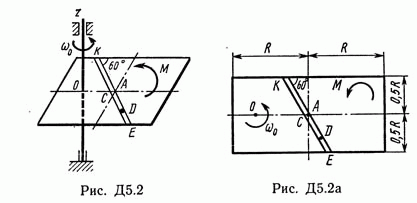 Д5 В24 - решение задачи по термеху из Тарга С.М. 1989 года. Условие к задаче Динамика 5: Однородная горизонтальная платформа (круглая радиуса R или прямоугольная со сторонами R и 2R, где R = 1,2 м) массой m1 = 24 кг вращается с угловой скоростью омега0 = 10 с-1 вокруг вертикальной оси z, отстоящей от центра масс C платформы на расстоянии OC = b (рис. Д5.0 —Д5.9, табл. Д5); размеры для всех прямоугольных платформ показаны на рис. Д5.0а (вид сверху). В момент времени t0 = 0 по желобу платформы начинает двигаться (под действием внутренних сил) груз D массой m2 = 8 кг по закону s = AD = F(t) где s выражено в метрах, t — в секундах. Одновременно на платформы начинает действовать пара сил с моментом М (задан в ньютонометрах; при М<0 его направление противоположно показанному на рисунках). Определить, пренебрегая массой вала, зависимость омега = f(t), т. е. угловую скорость платформы, как функцию времени. На всех рисунках груз D показан в положении, при котором s>0 (когда s<0, груз находится по другую сторону от точки А). Изображая чертеж решаемой задачи, провести ось z на заданном расстоянии OC = b от центра С.