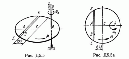 Д5 В55 - решение задачи по термеху из Тарга С.М. 1989 года. Условие к задаче Динамика 5: Однородная горизонтальная платформа (круглая радиуса R или прямоугольная со сторонами R и 2R, где R = 1,2 м) массой m1 = 24 кг вращается с угловой скоростью омега0 = 10 с-1 вокруг вертикальной оси z, отстоящей от центра масс C платформы на расстоянии OC = b (рис. Д5.0 —Д5.9, табл. Д5); размеры для всех прямоугольных платформ показаны на рис. Д5.0а (вид сверху). В момент времени t0 = 0 по желобу платформы начинает двигаться (под действием внутренних сил) груз D массой m2 = 8 кг по закону s = AD = F(t) где s выражено в метрах, t — в секундах. Одновременно на платформы начинает действовать пара сил с моментом М (задан в ньютонометрах; при М<0 его направление противоположно показанному на рисунках). Определить, пренебрегая массой вала, зависимость омега = f(t), т. е. угловую скорость платформы, как функцию времени. На всех рисунках груз D показан в положении, при котором s>0 (когда s<0, груз находится по другую сторону от точки А). Изображая чертеж решаемой задачи, провести ось z на заданном расстоянии OC = b от центра С.